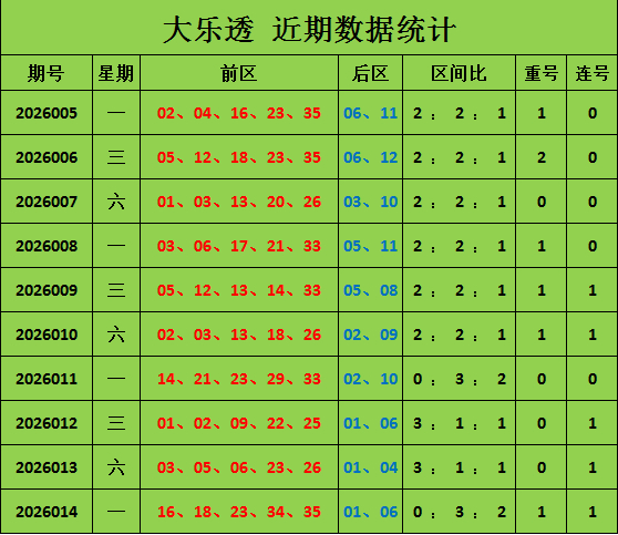 大乐透上期开出奖号:16 18 23 34 35+01 06,区间比是0 : 3 : 2,开出连号34 35,开出重号23。