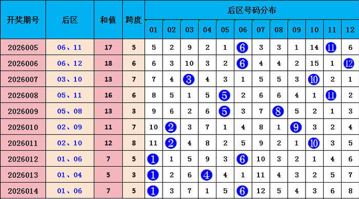 上期后区开出号码01 06,和值7,近十期和值17 18 13 16 13 11 12 7 5 7,和值波动领域较大,本期预测和值会飞腾,要点温雅号码:04 10,和值14。
