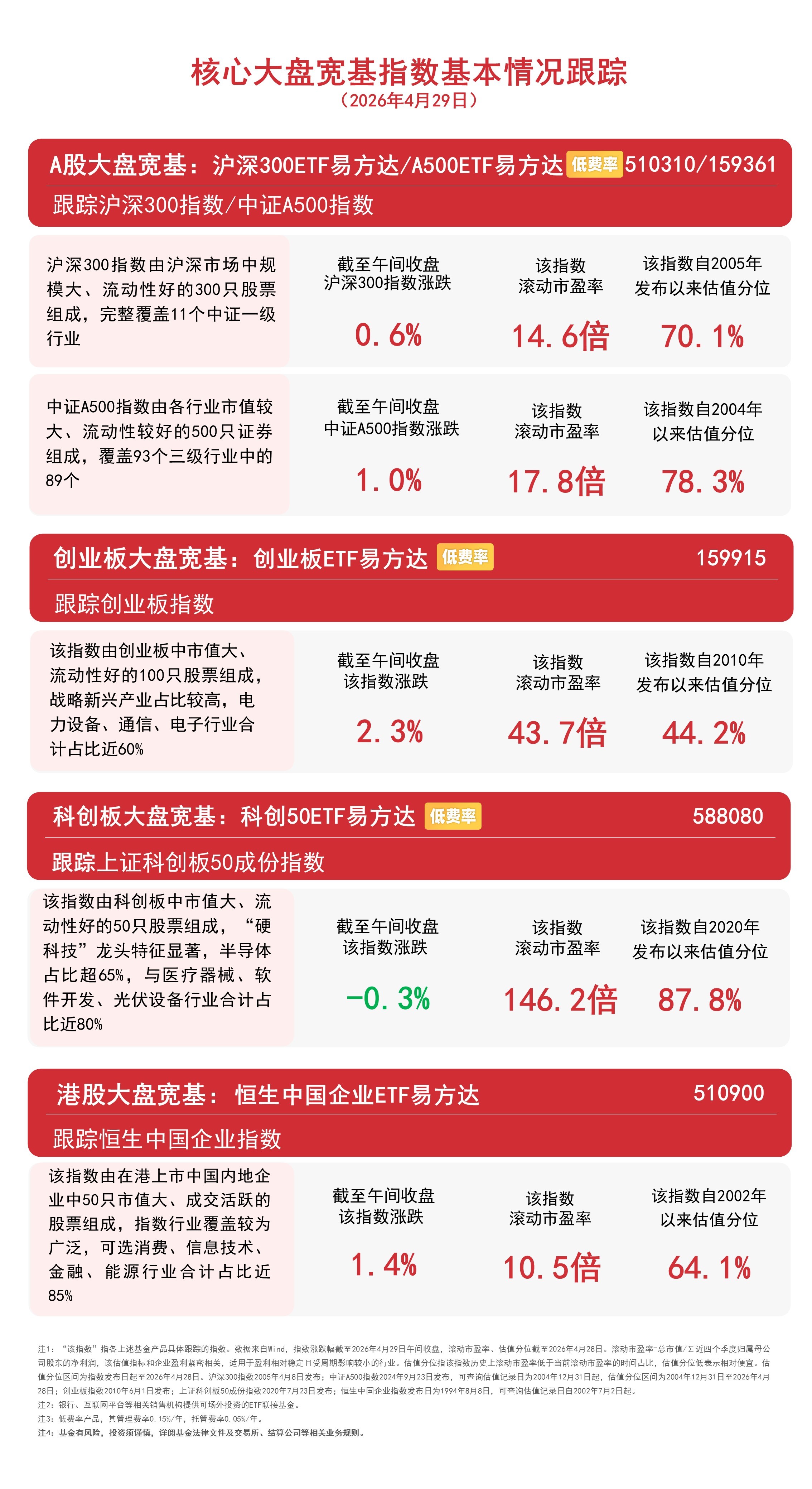 放弃午间收盘,中证A500指数高涨1.0%,沪深300指数高涨0.6%,创业板指数高涨2.3%,上证科创板50成份指数着落0.3%,恒生中国企业指数高涨1.4%。