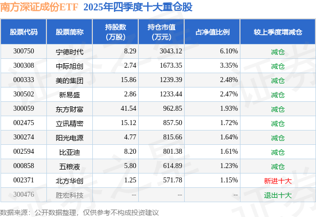 南边深证成份ETF基金设立于2009年12月4日,基金司理为孙伟,基金追踪方向为深证成份指数(价钱),设立以来逾额薪金为24.0%,近一个月逾额薪金为-0.02%。最新流露的基金抓仓数据暴露,闭幕2025年12月31日,该基金第一大重仓股为宁德时期(300750),抓股占比为6.1%。
